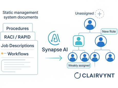 Clairvynt AI's Synapse maps procedure roles and responsibilities directly to the live organisation chart, connecting every requirement in the management system to real people and positions. It identifies where roles are not fully assigned, highlights gaps that emerge when teams are slimmed down or restructured, and suggests where responsibilities could be reallocated.